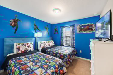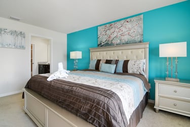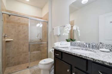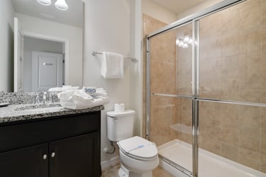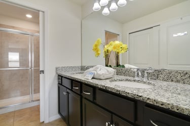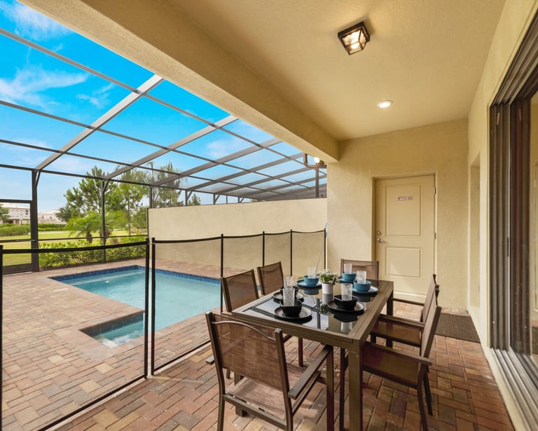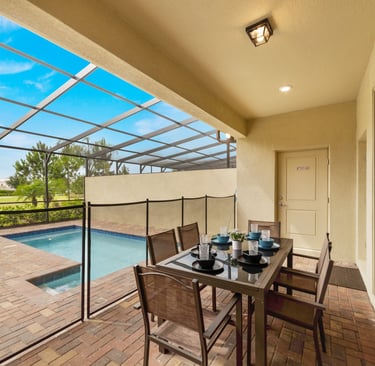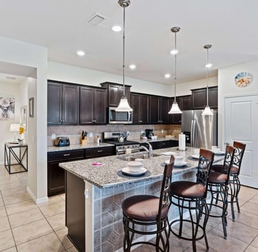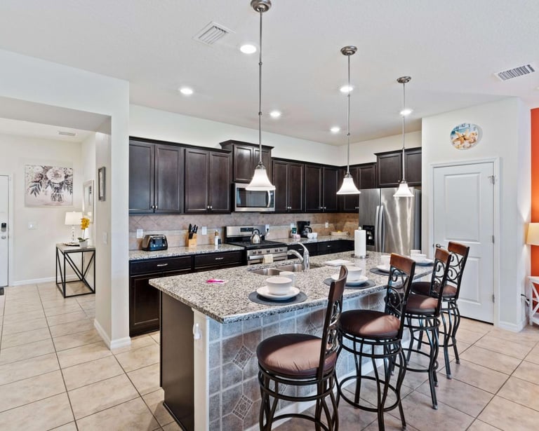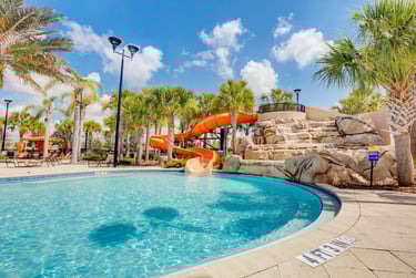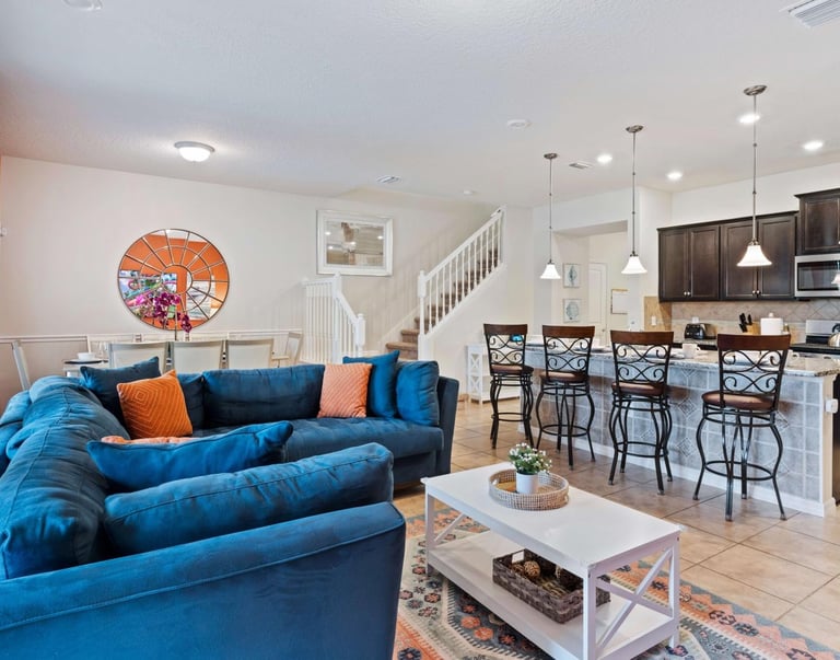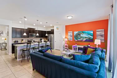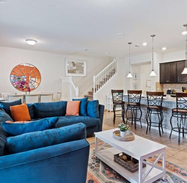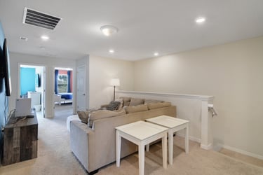 The Splash is an upscale 2 story townhome wonderland, perfect for your next vacation. It is your home away from home in the beautiful Solterra Resort! This charming townhome features 5 cozy bedrooms, 4.5 bathrooms and blends luxury with comfort for everyone. Just minutes from Disney World and Hollywood Studios, our retreat includes a covered lanai with a private, in-ground pool—perfect for family fun and relaxation. Make magical memories together in a place designed with families in mind.